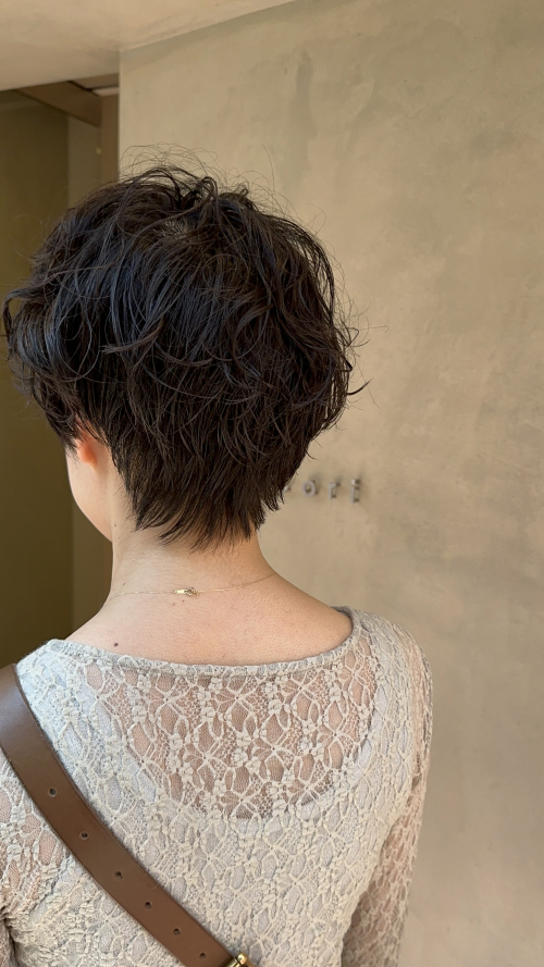 残っていたパーマをうまく活かして、動きのあるラフなショートスタイルに仕上げました。